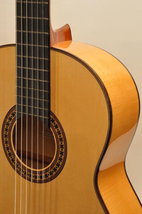 Flamenco guitar with charm thanks to the beauty of the flamed maple of the back and sides. The finish is very detailed and grace. Playability is wonderful, all along the smooth neck it feels soft and the left hand can slide nimbly. The sound is very flamenco like, bright and colourful but at the same time balanced and steady in all registers.
