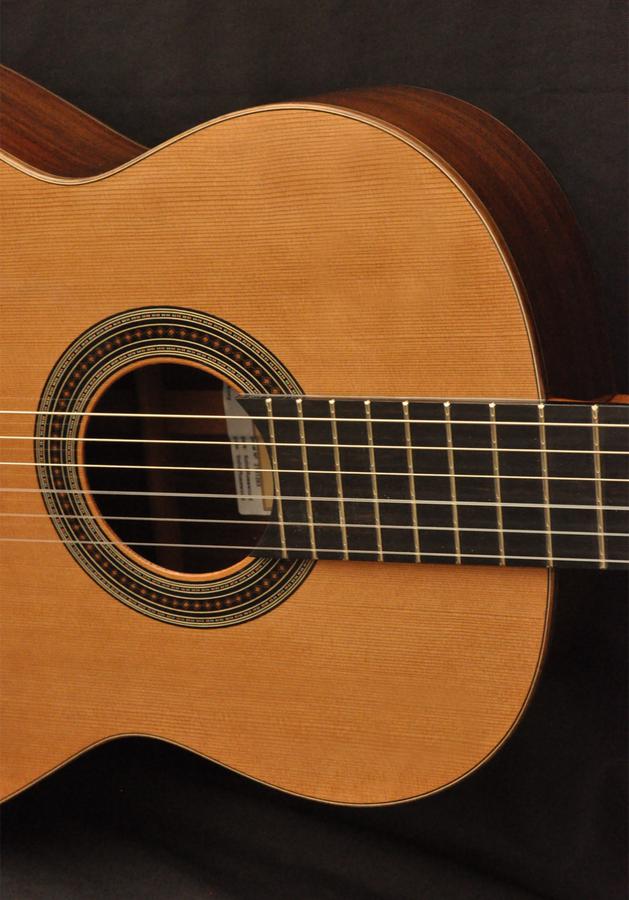 This model is faithful to the true original Spanish classical guitar. It is fully traditional in construction design and style and it has such a classic and warm sound. The back and sides are made from solid India rosewood, and the top from high quality carefully selected soundboards. These features give a penetrating sound but pleasant at the same time.