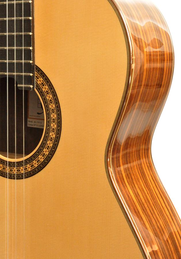 Elegant concert guitar made from 1st pick of the 1st class soundboards, back and sides. The tone is steady and clear in every register and perfectly balanced, with great attack.