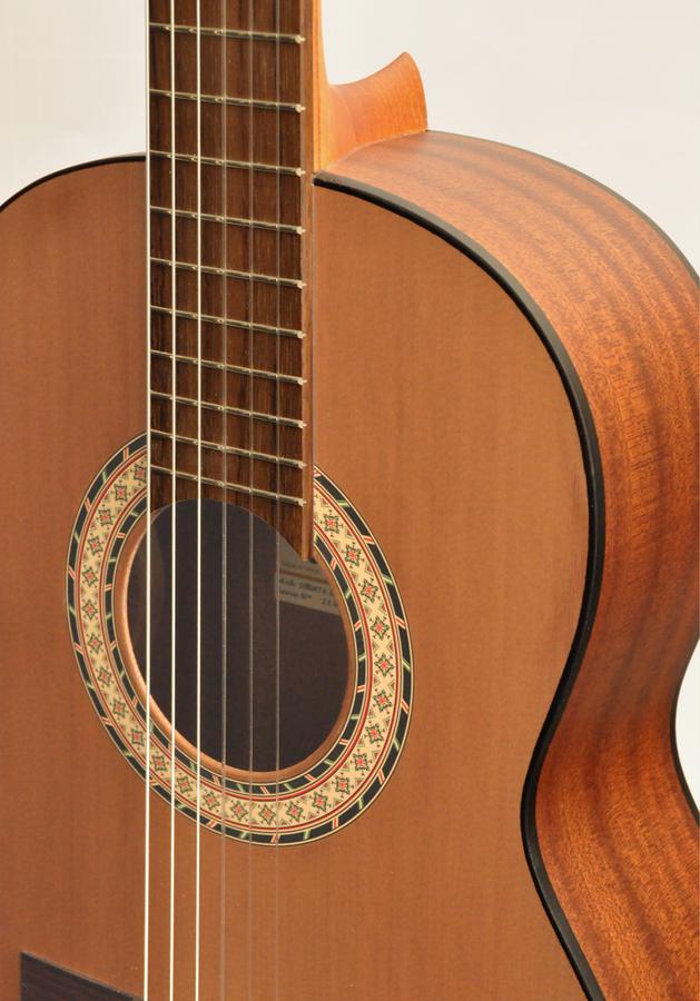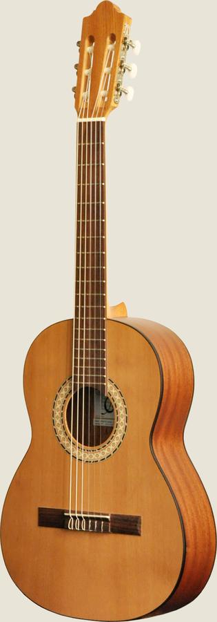 Model with a smaller scale length, perfect for children because it is very light and comfortable. The solid cedar or spruce top provides a warm and powerful sound. Mat varnish finish which keeps the natural tone of the wood.
